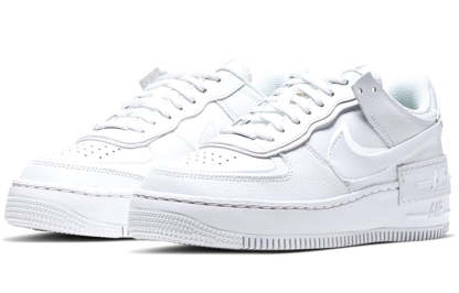 The NK Women��s Air Force 1 Shadow ��Triple White�� is the perfect sneaker for any stylish woman. With its deconstructed design, dual layers at the eyestays and mudguard, and two times the branding at the heel, tongue and insole, this sneaker is sure to turn heads. And with its thickened midsole foam for extra height and comfort, you��ll be able to wear it all day long.